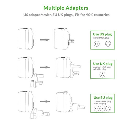 Caricatore da muro portatile graduato per viaggio - l'adattatore da viaggio con adattatori rimovibili UK EU US è facile da montare in un gadget All-in-One. Regolazione automatica della tensione tra 100v e 240v, dimensioni ridotte e facile trasportabilità rendono il caricatore USB facile da trasportare e adatto al viaggio.