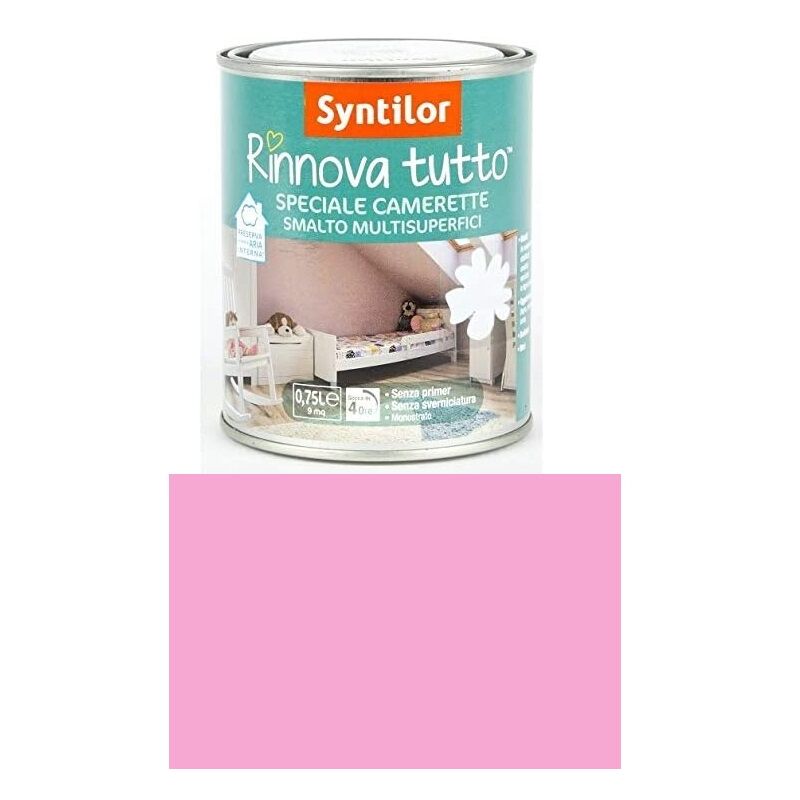 SYNTILOR - RINNOVA TUTTO SMALTO SPECIALE CAMERETTE 0,750 LT CONFETTO Syntilor ha creato per voi lo Smalto Rinnova tutto Speciale Camerette. Con una pennellata rinnovate l'atmosfera della cameretta del vostro bambino! Prodotto sano: inodore per rispettare l'utente e il bambino Efficace: senza sverniciatura, senza primer. Rapido: prodotto pronto per l'uso, lavoro finito in un week-end. Punti di forza: Inodore, Ultra resistente, Lavabile, Aspetto finale perfetto, Aspetto satinato, Preparazione