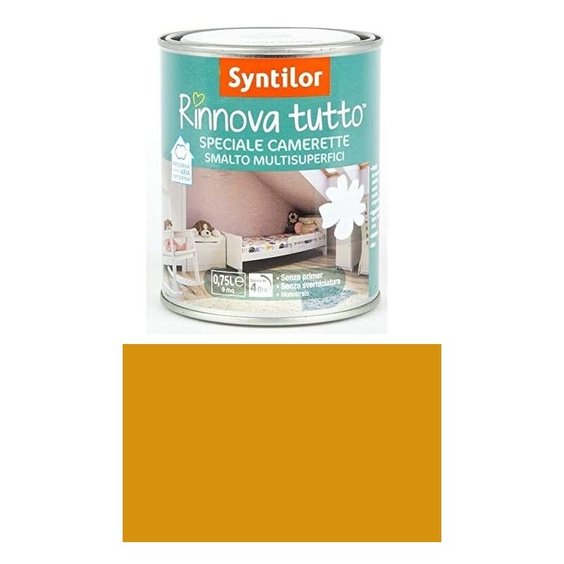 SYNTILOR - RINNOVA TUTTO SMALTO SPECIALE CAMERETTE 0,250 LT ENERGY Syntilor ha creato per voi lo Smalto Rinnova tutto Speciale Camerette. Con una pennellata rinnovate l'atmosfera della cameretta del vostro bambino! Prodotto sano: inodore per rispettare l'utente e il bambino Efficace: senza sverniciatura, senza primer. Rapido: prodotto pronto per l'uso, lavoro finito in un week-end. Punti di forza: Inodore, Ultra resistente, Lavabile, Aspetto finale perfetto, Aspetto satinato, Preparazione