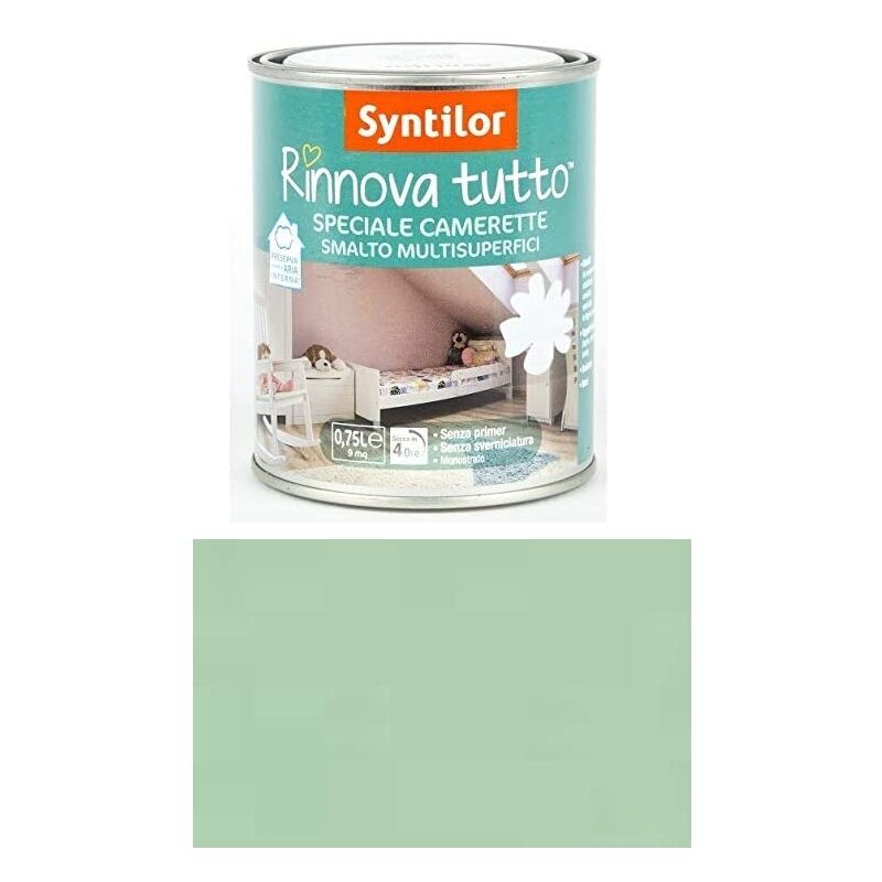 SYNTILOR - RINNOVA TUTTO SMALTO SPECIALE CAMERETTE 0,750 LT GERMOGLIO Syntilor ha creato per voi lo Smalto Rinnova tutto Speciale Camerette. Con una pennellata rinnovate l'atmosfera della cameretta del vostro bambino! Prodotto sano: inodore per rispettare l'utente e il bambino Efficace: senza sverniciatura, senza primer. Rapido: prodotto pronto per l'uso, lavoro finito in un week-end. Punti di forza: Inodore, Ultra resistente, Lavabile, Aspetto finale perfetto, Aspetto satinato, Preparazione