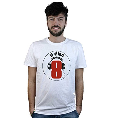 T-Shirt Italo Disco Dj, Maglietta Bianca Disc8 con Logo Musica Dance Anni 80
