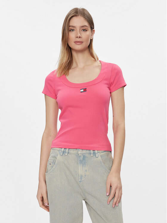 Tommy Jeans T-shirt Tjw Slim Badge Rib Tee Ss DW0DW17396 Rosa Slim Fit