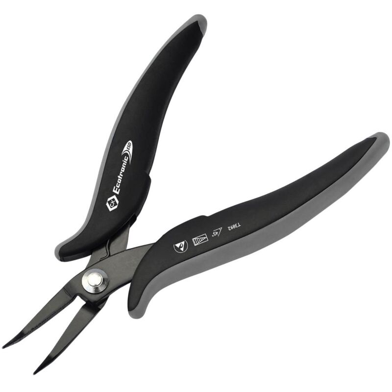 Dettagli tecnici Campo di impiego ESD Dimensione del prodotto, lunghezza 152 mm Materiale Acciaio al carbonio Proprietà del materiale altamente legato, brunito Tipo prodotto Pinza a becchi appuntiti Pinza a becchi curvi C.K Ecotronic ESD Per maneggiare in sicurezza piccoli componenti in applicazioni di precisione (per es. microelettronica e meccanica di precisione) Corpo in acciaio speciale per utensili, temprato per prestazioni a lungo termine Finitura brunita per resistenza contro la corrosione e riduzione della lucentezza Manici a dispersione elettrostatica - dissipativi 10⁸ Manici bimateriale di forma sagomata per un lavoro confortevole Molla di richiamo ad azione fluida per praticità nei lavori ripetitivi Cerniera con rivetto in acciaio inossidabile duraturo Pinza a becchi curvi leggera di precisione con punte piegate a 45° Becchi lunghi, dentellati Esterno dei taglienti arrotondati per ridurre il rischio di danni di componenti circostanti Informazioni Tecniche: Lunghezza totale