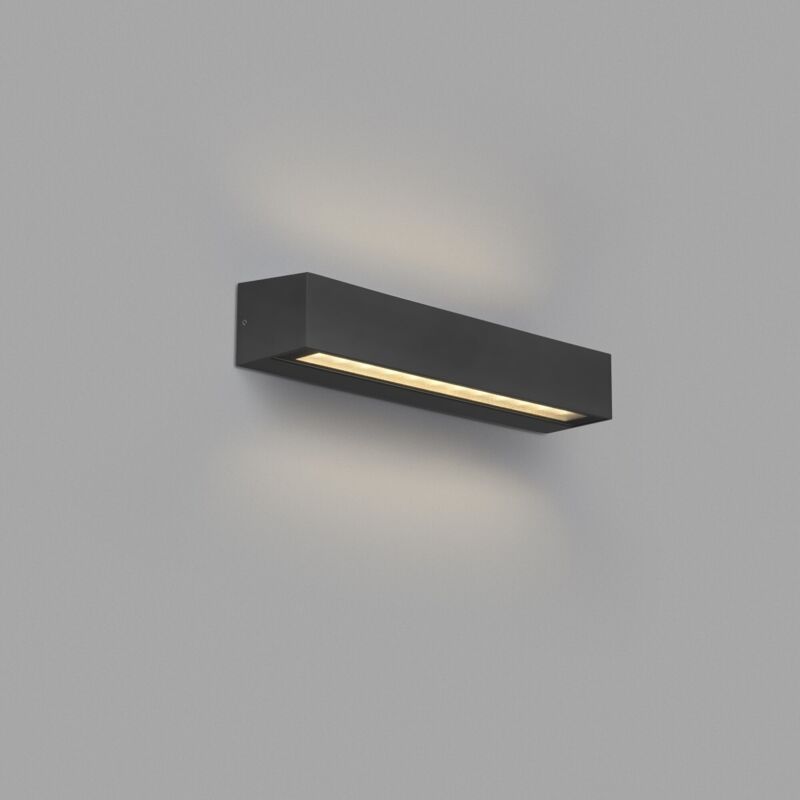 Aplique de 38cm de ancho con luz arriba y abajo LED 20W 3000K integrado. Tiene una luminosidad de 1800Lm. Cuerpo fabricado en aluminio acabado en gris oscuro, y difusor de cristal. Dispone de una protección IP65, apto para exterior.