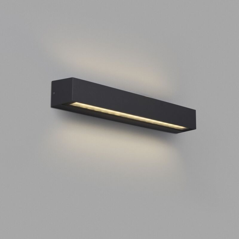 Aplique de 50cm de ancho con luz arriba y abajo LED 28W 3000K integrado. Tiene una luminosidad de 2700Lm. Cuerpo fabricado en aluminio acabado en gris oscuro, y difusor de cristal. Dispone de una protección IP65, apto para exterior.