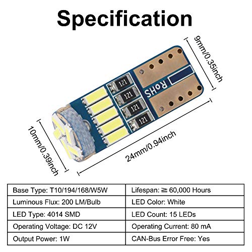 TABEN Lampadina T10 bianca LED 194 T10 LED CANBUS 15-SMD 4014 Car LED Targa luce Errore Canbus LED gratuito Cupola Mappa Luci di posizione laterali DC 12V (confezione da 10)
