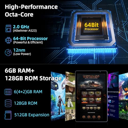 【6 GB di RAM + 128 GB di ROM 】 Questo tablet da 10 pollici è dotato di 6 GB di RAM (4 GB + 2 GB ottenuti tramite la tecnologia di espansione), 128 GB di ROM e uno slot per schede micro-SD che consente un'espansione di 512 GB di memoria, offrendoti anche più spazio per archiviare foto, video e musica. Il tablet è dotato di una potente CPU Octa-core A523 da 2,0 GHz, che offre prestazioni e operazioni fluide e veloci.