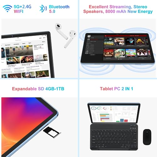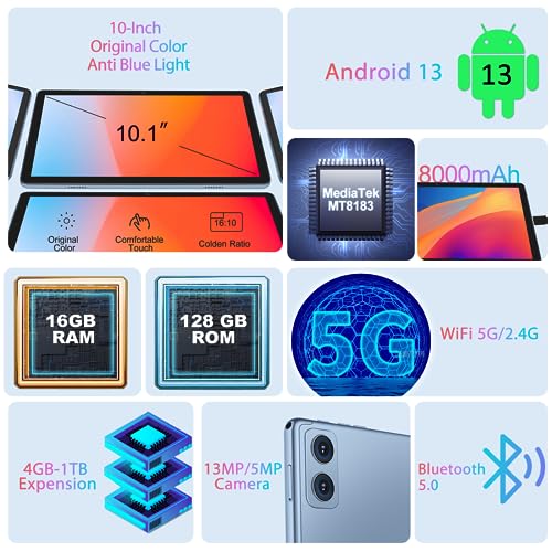 Tablet 10 Pollici Android 13 16GB RAM+128GB ROM (1TB TF) Memoria Flash UFS, 8-Core 2.0GHz, WiFi 5G, Bluetooth 5.0, GPS, GMS Certified, 13MP+5MP, Batteria 8000mAh, con Custodia, Tastiera e Mouse, Blu