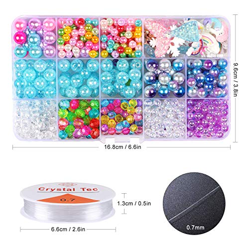 Kit per la creazione di collane e bracciali: Otterrai 400 pezzi + perline e ciondoli in diversi colori e forme, i bambini possono usare la linea elastica di cristallo per creare bellissime collane e braccialetti con diverse combinazioni di perline in base alle loro preferenze e abbinarli a ciondoli unici, come sirena, unicorno, arcobaleno, cuore, fiocco di neve, ecc.