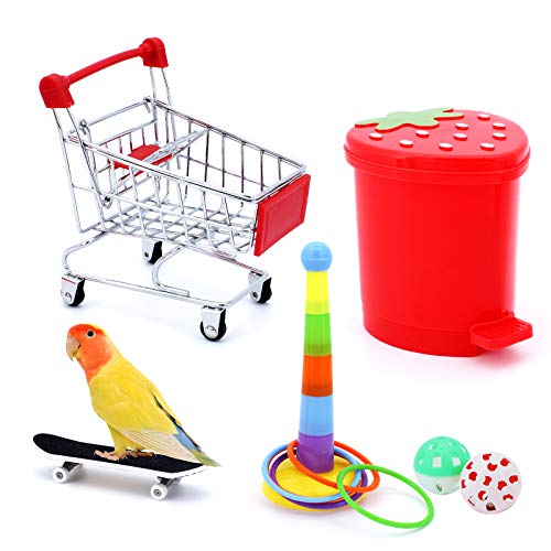 TAECOOOL 6PCS Giocattoli di addestramento per pappagalli, Mini Carrello della spesa - Anelli di addestramento - Skateboard, pattumiera e due palle - Giocattoli per pappagalli e accessori