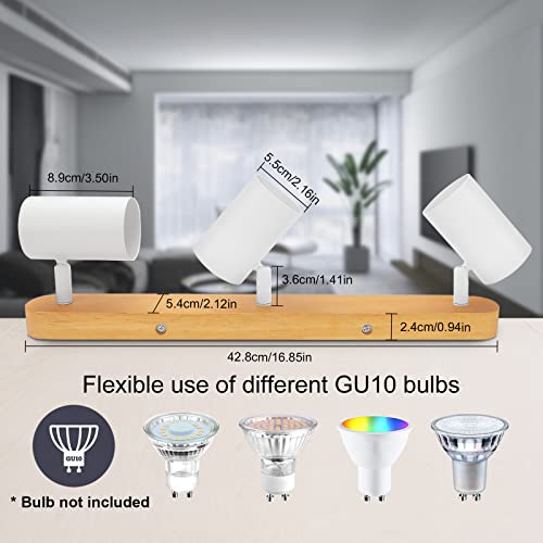 TaFiCo Lampada Faretti Soffitto Orientabili - Faretti LED Interno 3 Luci Legno Plafoniere Soffitto Moderna GU10 Applique Faretto Legna per Cucina Camera da Letto Soggiorno, Bianco (Senza Lampadina)