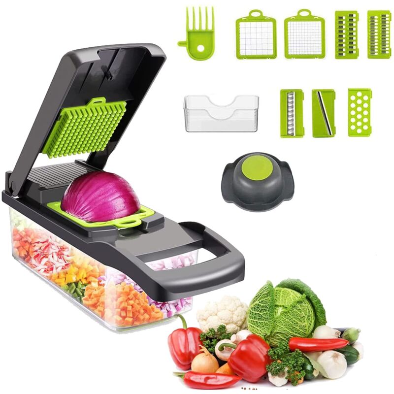 Tritatutto per verdure 11 in 1 - : Tutti i gadget da cucina multifunzione per affettatrice di verdure mandolino sono adatti per tagliare quasi tutte le verdure e la frutta. Poiché include 7 lame da taglio intercambiabili, 1 contenitore, 1 cestello per lo scarico degli alimenti, 1 protezione per le mani e 1 spazzola per la pulizia.