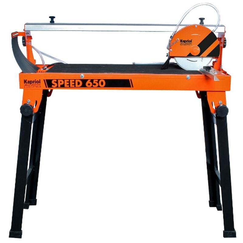 TAGLIAPIASTRELLE SPEED 650 KAPRIOL Macchina compatta e versatili dalla struttura estremamente robusta indicata per il taglio di piastrelle, graniti e pietre. DESCRIZIONE: • Robusta struttura interamente in acciaio verniciato a polvere per garantire protezione contro sporcizia e umidità• Robusta guida di scorrimento della testa in lega di alluminio• Cuscinetto della guida orizzontale• Testa di taglio inclinabile per tagli da 90 a 45°• Guida appoggia pezzo completa di goniometro• Dotata di pompa elettrica a immersione con speciale alloggiamento per evitare l'intasamento da residui• Carter• Le maniglie saldate sul telaio facilitano lo spostamento• Disgiuntore• Potenza: 800 W • Profondità di taglio: 30 mm 90° - 25 mm 45° • Disgiuntore di corrente PRCD: In dotazione • Protezione: Ip54 • Utilizzo a umido: SI • Possibilità di inclinazione della testa: 90°/45° • Dimensioni piano di lavoro: 595×403 mm • Possibilità di taglio a calata dall'alto: NO • Piano ausiliario smontabile: NO PRODOTTO DI