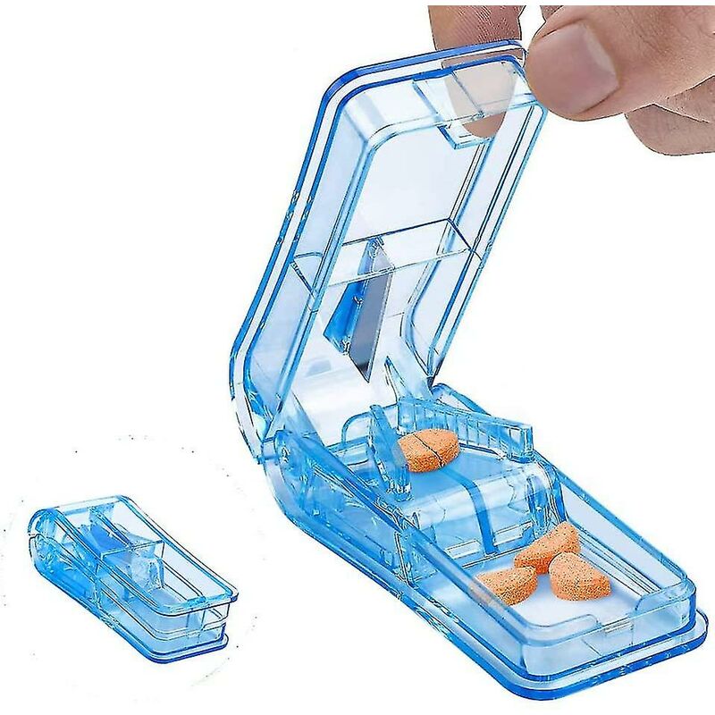 Tagliapillole, Tagliapillole Portatile con Lama per Pillole Piccole Pillole Grandi Tagliate a Mezzo Quarto, Tagliapillole Tagliapillole 2 in 1 con Custodia per Pillole Compresse, Blu TrasparenteSpecifiche:Materiale: Acciaio Inossidabile+PlasticaColore: Traslucido bluDimensioni: 9x4x3 cm / 3,6x1,6x1,2 polliciIstruzioni: 1. Comodo da usare: tagliapillole 2 in 1 con custodia 2. Lama affilata tagliata in qualsiasi forma: pillole tagliate con precisione in tutte le forme (1 /2, 1/4 e 1/8) 3. Supporto a forma di V: può afferrare pillole di quasi tutte le dimensioni, perfetto per tutte le forme di pillole. (Diametro inferiore a 2,5 cm) 4. Facile da pulire e trasportare: dimensioni compatte, facile da trasportare in borsa, borsa, tasche o valigia. 5. Tagliapillole semplice e perfetto: uno strumento prezioso per la tua famiglia e gli animali domestici. Nota: Si prega di tenere il tagliapillole lontano dai bambini. La confezione include: 1 tagliapillole