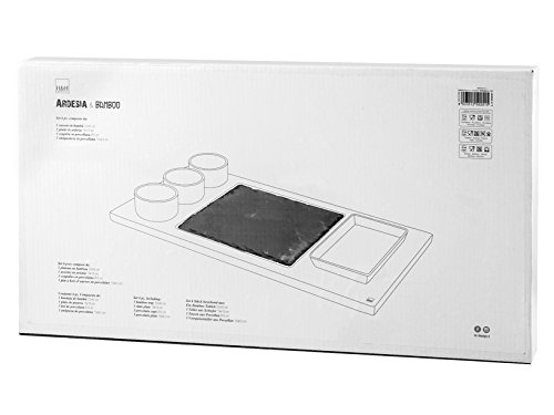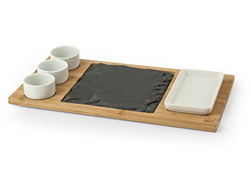 Set aperitivo composto da: 1 supporto in bambù, 1 piatto in ardesia, 3 coppette e 1 antipastiera in porcellana