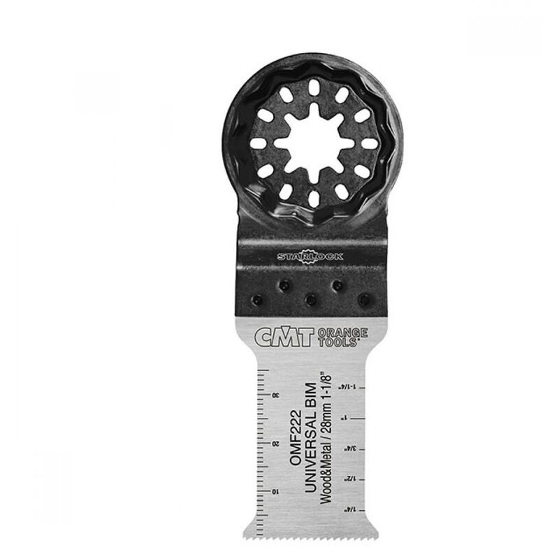 Lama per taglio legno e metallo, Bimetal da 28 mm - CMT OMF 222 Universal CARATTERISTICHE: Bimetal con 8% di Cobalto, denti fresati e linea di taglio ondulata. MATERIALI: Per lamiere fino a 2mm, profili d'alluminio, tubi in rame e ottone, legno, cartongesso e plastica. APPLICAZIONE: Ampia gamma di applicazioni. Forma ristretta al centro per avanzamento rapido e buona asportazione del truciolo.