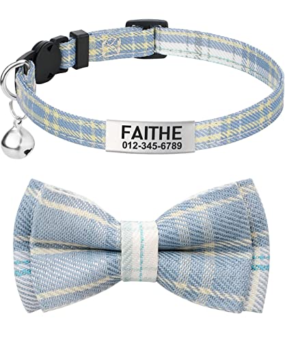 TagME Collare per Gatti Personalizzato, con Papillon e Targhetta Identificativa Collari per Gatto,Plaid Azzurro