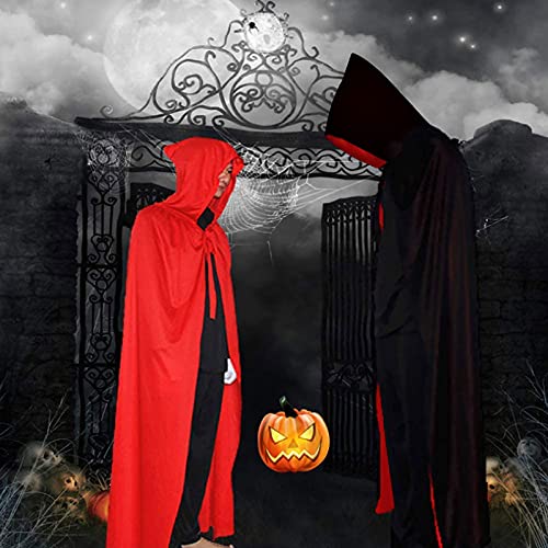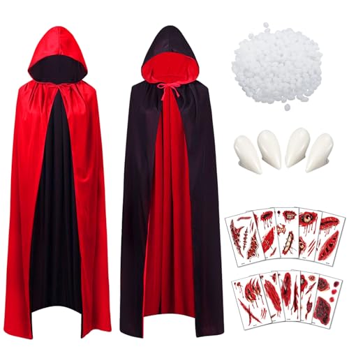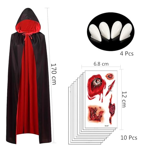 TaimeiMao 170cm Mantello Vampiro Nero Rosso,Mantello di Halloween,Mantello con Cappuccio,Mantello Double Face Halloween con Cappuccio Halloween Costume Unisex Mantello,con Denti, Adesivi per Tatuaggi