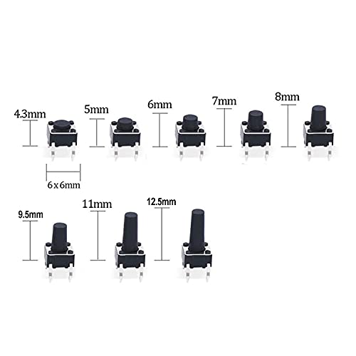 Dimensioni interruttore e qualità: 6 x 6 x 4.3 mm 25 pezzi/5 mm 25 pezzi/6 mm 25 pezzi/7 mm 25 pezzi/8 mm 25 pezzi/9.5 mm 25 pezzi/11 mm 25 pezzi/12.5 mm 25 pezzi/7 x 7 mm Interruttore tattile a scatto 8 pezzi/7 x 7 mm Interruttore tattile momentaneo 8 pezzi.