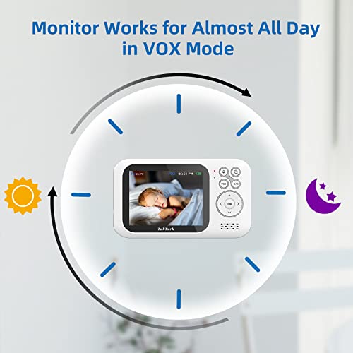 【Modalità Vox】Questo telecamera bambini con monitor è dotato di una batteria integrata da 1150 mAh e ha un'autonomia estremamente lunga in modalità VOX. In modalità VOX, il monitor passa automaticamente alla modalità standby per risparmiare energia, per una pausa tranquilla e rilassante. Il display del monitor si illumina quando il bambino inizia a piangere, ricordando ai genitori di controllare ogni movimento del bambino.
