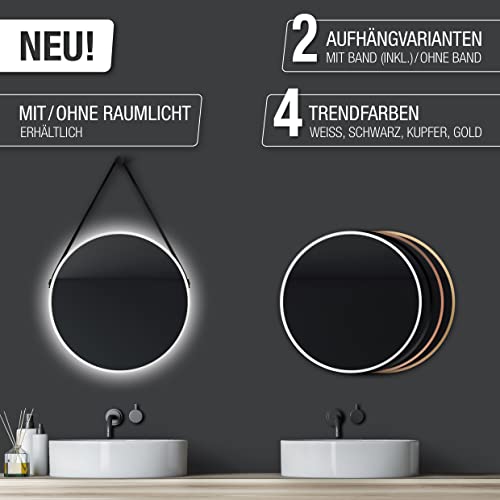 Specchio rotondo con diametro di 50 cm, distanza tra specchio e punto di fissaggio è di 25 cm.