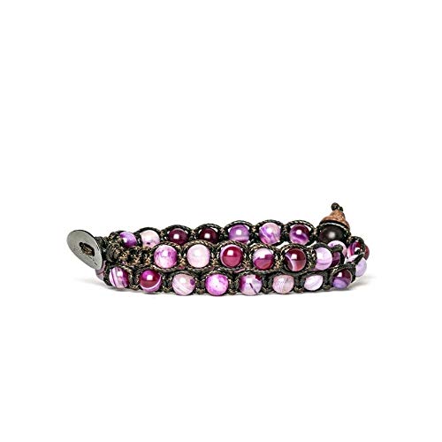 Tamashii Bracciale Unisex Collezione Long. Gioiello Realizzato con Un Cordino di Cotone, Calabash in Legno e Agata di Colore Magenta Striato. Bracciale della Lunghezza Regolabile da 16 cm a