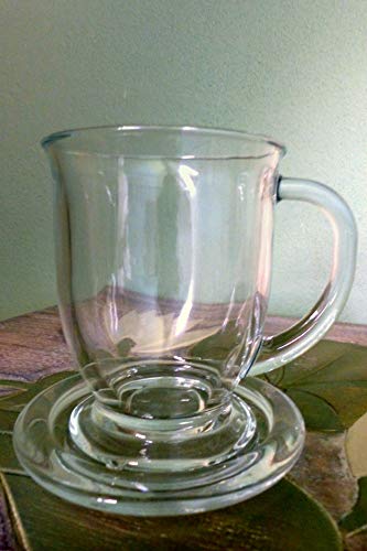 Tazza grande in vetro con sottobicchiere o coperchio (a seconda dell'uso), adatta per bevande calde o fredde.