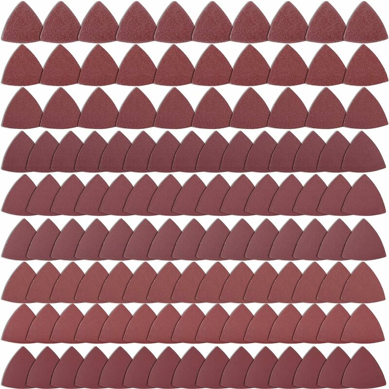 e 120#, 150#, 180#, 240#, 320#, 400#, 15 fogli per ogni grana Formato: 80 mm x 80 mm x 80 mm, adatto per multiutensile oscillante triangolare Materiale premium: i fogli abrasivi sono realizzati in ossido di alluminio abrasivo, resistente e antistatico, inoltre la grana è più grande, più fine è l'effetto lucidante Tecnologia di supporto: i tamponi abrasivi triangolari sono dotati di un gancio e un anello posteriore, che è facile e veloce da attaccare e togliere dalla levigatrice. I tamponi abrasivi triangolari aiutano a raggiungere gli angoli stretti, efficaci per la levigatura e la lucidatura Ampia applicazione: queste carte abrasive sono ottime per la levigatura del legno, utilizzare grana 40/60/80 per la levigatura.legno grezzo, utilizzare 120/150/180 grana per legno generico, usa grana 240/320/400 per la finitura finale del legno, puoi anche