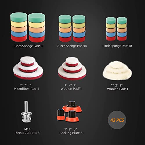 Tamponi per lucidatura,Tampone di lucidatura, Kit lucidatura con Adattatore per Trapano M14, Set di 43 Pezzi lucidatura Pad Spugna, lucidatura Lana tampone per Lucidatrice per Auto -POSWMIX36