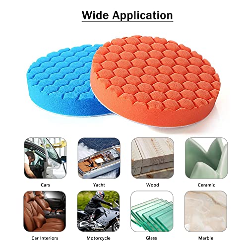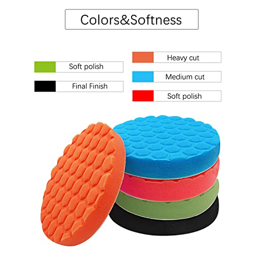 Design unico: i tamponi per lucidatura a logica esagonale in schiuma sono disponibili in cinque diversi colori con diverse durezze per diverse esigenze di taglio, facili da distinguere e migliorare l'efficienza del lavoro. I tamponi per lucidatura sono leggeri e molto facili da montare. taglio e lucidatura efficienti dei rivestimenti di ossido per autoveicoli più difficili, graffi.