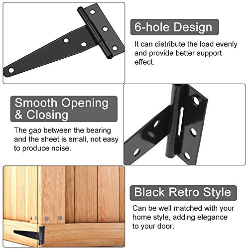 【Ampia applicazione】Le cerniere a T nere sono ideali per dispositivi meccanici che collegano due entità e consentono la rotazione tra di loro. Adatto per finestre a shed, persiane, fioriere, porte, recinzioni e cassette in legno per finestre, ecc.
