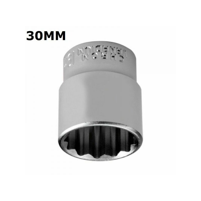 Bussola poligonale in CHROME VANADIUM 30mm Utilissima boccola con attacco misura 3/4 pollici da 30mm si può usare sia con chiave a cricchetto che chiavi a T. Un utensile molto usato nel campo della meccanica per stringere oppure svitare dadi e bulloni. Caratteristiche tecniche: CHROME VANADIUM Misura 30mm attacco 3/4 Altezza 56mm circa Contenuto: Nr. 1 Boccola poligonale 30mm