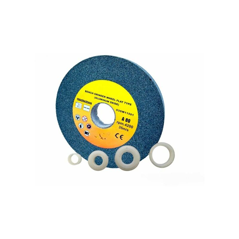 DISCO MOLA PIETRA ABRASIVA PER SMERIGLIATRICE DA BANCO 150mm 150x20x32mm Disco mola da banco pietra abrasiva grana 80 ossido alluminio tipo flat 150mm Ottimo disco di ricambio per mola da banco dotato di adattatori delle misure Ø 12,7 - 16 - 20- 25,4 mm Il disco ha le dimensioni di: 150 x 20 x 32 mm con grana di tipo 80 e di alluminio ossido. Ideale per mola da banco e necessita di un disco di ricambio. Utile sia per il fai da te, che professionale Caratteristiche tecniche: Alluminio ossido Dimensioni: 150x20x32 mm Grana tipo: 80 RPM: 4450 35m/s La confezione: Nr. 1 Disco per mola