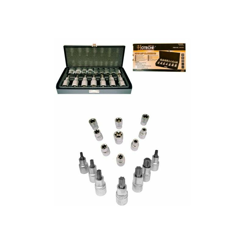 Serie di bussole torx maschio femmina attacco da 1/2 Comoda cassetta in metallo contenente 16 bussole con impronta torx maschio e femmina con attacco da 1/2 al cromo vanadio. Misure Bussole: Maschio 1/2: T30 -T40 - T45 - T50 - T55 - T60 - T70 Femmina 1/2: E10 - E11 - E12 - E14 - E16 - E18 - E20 - E22 - E24