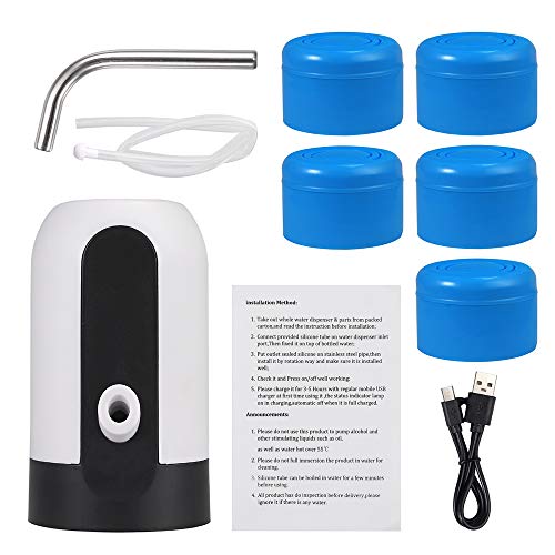 TANiCE - Distributore d'Acqua in Bottiglia Automatico Ricaricabile Dispenser di Acqua Imbottigliata Universale Erogatore d'Acqua in ABS Tubo in Acciaio Inox Pompa Acqua Elettrica con 5 Tappi - Bianco