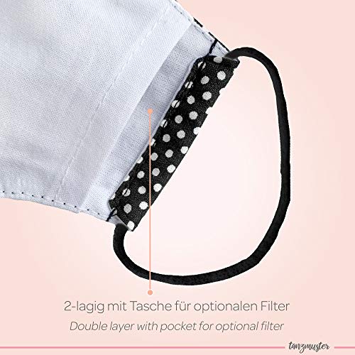 Tanzmuster ® mascherina lavabile per adulti - 100% cotone OEKO-TEX 100 con nasello e tasca per filtro - Community mask fatta a mano e riutilizzabile, 2 strati nero bianco punteggiato di bianco L