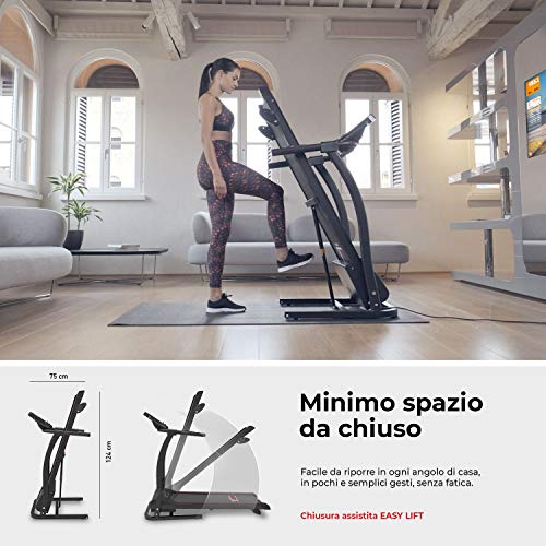 MULTIFUNZIONE E PERFORMANTE. Tapis roulant compatto e pieghevole - Velocità da 1 km/h a 14 km/h - Apertura servoassistita ‘soft drop' con cilindro idraulico - 16 programmi di allenamento - Funzioni computer: pulsazioni, velocità, distanza, tempo e calorie - Tasti velocità +/- e start/stop anche sul manubrio - Inclinazione regolabile - Sensori Pulse - Ingresso audio (jack, SD, USB) e altoparlanti - Facile da riporre - Ampio display digitale LCD - Regolazione velocità e della modalità di corsa.