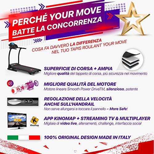 APP. Provate il divertimento e nuovi metodi di allenamento con le nuove App compatibili ZWIFT e KINOMAP (selezionando il brand Your Move) che consentono anche di proiettare video e percorsi di allenamento direttamente su TV e PC mentre si corre (o visualizzarli su Smartphone e Tablet) + condividere l'allenamento con amici + seguire allenamenti strutturati e raggiungere obbiettivi + funzione musica motivazionale + cronologia allenamento individuale + video coaching e moltissime altre funzioni.