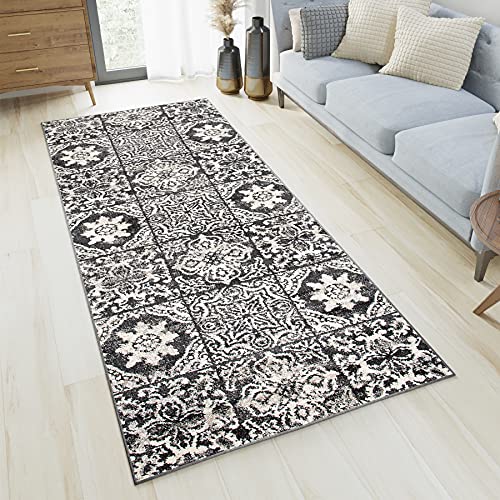 TAPISO Ethno Tappeto Passatoia Corridoio Cucina Camera da Letto Scendiletto Grigio Scuro Crema Moderno Floreale A Pelo Corto 70 x 150 cm