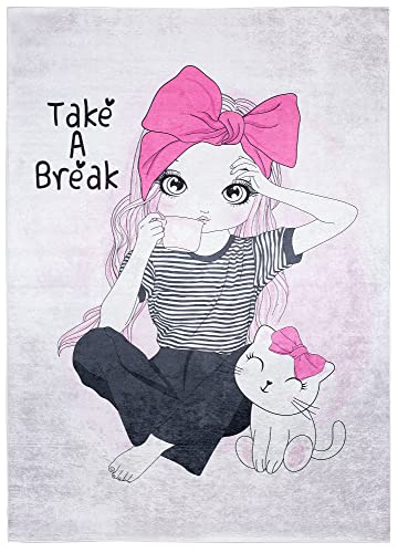 TAPISO Emma Tappeto Gioco Bambini Sala Giochi Cameretta Stanza Bambini Stampato Morbido Rosa Grigio Bambina Gatto Antiscivolo Lavabile in Lavatrice 160 x 230 cm