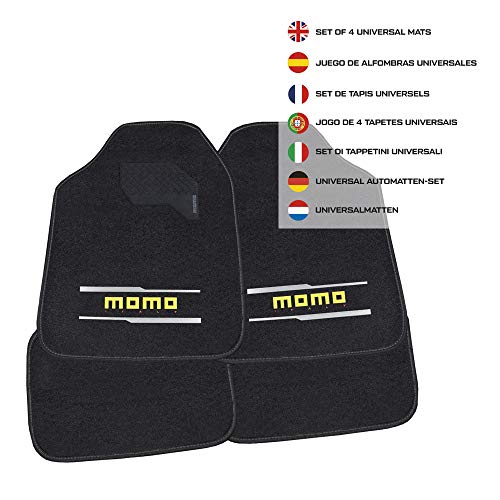 GENERALE: Set di 4 tappetini auto universali MOMO adatti a quasi tutti i veicoli. Questo set di tappetini per auto comprende i due tappetini anteriori per il conducente e il passeggero anteriore e i due tappetini posteriori. Sono tappetini di qualità MOMO resistenti all'attrito, che uniscono tradizione e innovazione e sono adatti a tutte le condizioni atmosferiche.