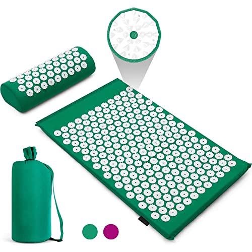 Tappetino Agopressione Set Con Cuscino Da Massaggio Verde, Materassino Massaggiante 68x42cm, Massaggio Schiena, Cuscino Cervicale Massaggiante e Borsa Da Trasporto Per Sollievo e Relax (Verde)