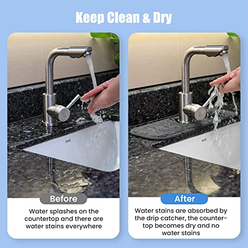 ✅【Ampiamente Usato】 - Il tappetino assorbente del rubinetto è adatto per piani di lavoro da cucina, lavelli del bagno e rubinetti per camper. Se lo spazio dietro il rubinetto è limitato, piega semplicemente la parte oltre il piano del lavabo