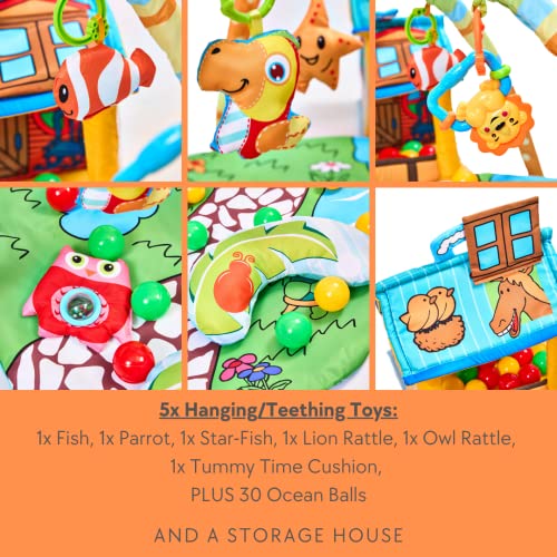 Questioni di sicurezza - Non tossico e senza piombo/BPA/ftalati. Panno morbido e inserti in schiuma. Lavabile e completamente lavabile, con pali ad arco, magazzino, giocattoli, palline oceaniche e cuscino.