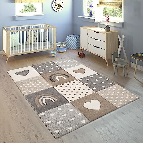 Paco Home Tappeto Bambini Cameretta Arcobaleno Polkadot Cuore 3D, Dimensione:200x290 cm, Colore:Beige 2