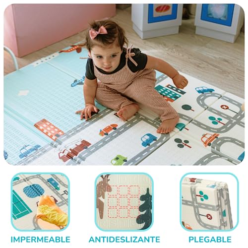 Lasciate che i vostri bambini giochino a proprio agio sul pavimento in modo sicuro con questo divertente tappeto bifacciale.