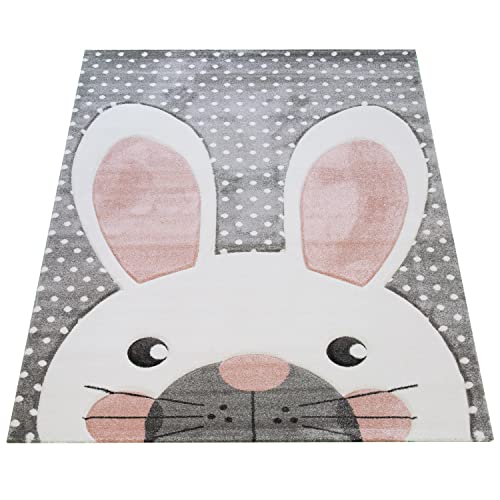 Paco Home Tappeto per Bambini Stanza dei Bambini Taglio Sagomato Grazioso Coniglio Grigio Crema Rosa, Dimensione:80x150 cm