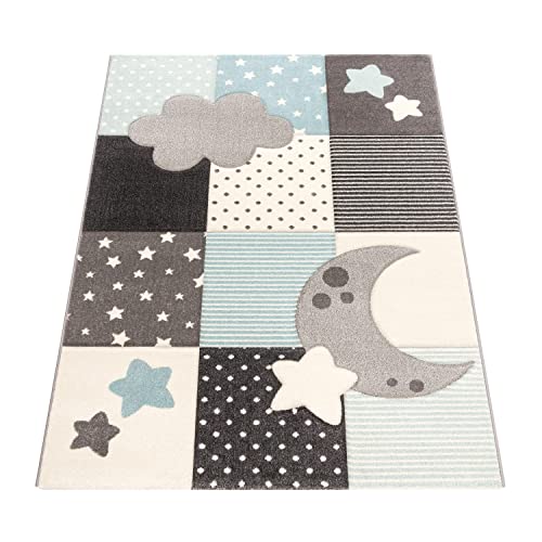 Tappeto per la cameretta dei Bambini con Quadri, Punti, Nuvole, Stelle nei Colori Pastello Blu-Grigio, Dimensione:140x200 cm
