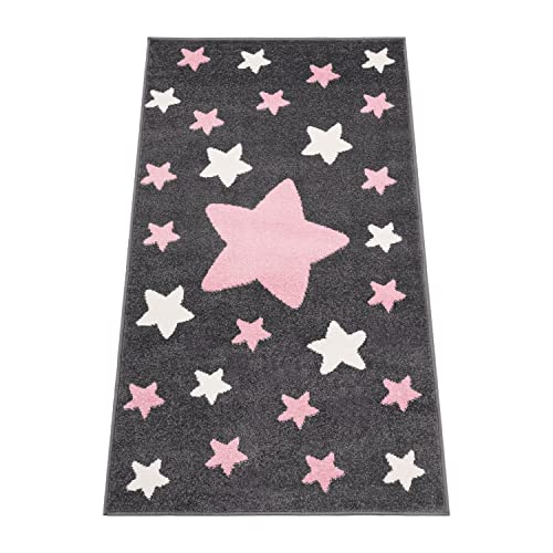 UMI. Tappeto Pelo Corto da Gioco con Stelle Design Moderni Colori Rosa Grigio Pastello, Farbe:Grigio, Größe:80x150 cm