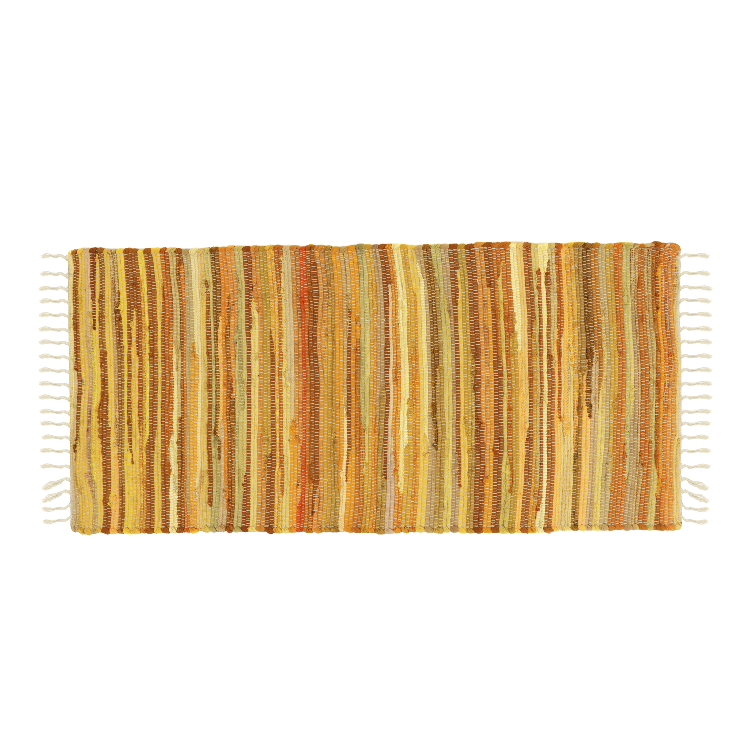 La linea tessile Happy Color porta un tocco vivace e allegro nella tua casa. Il tappeto in misto cotone e poliestere è ideale da posizionare sul pavimento della cucina per preservarlo da macchie di cibo, schizzi di unto ed eventuali graffi causati dalla suola di ciabatte e calzature. Con il suo design impreziosito da intrecci colorati sui toni dell'arancione, è completato da frange laterali bianche che lo rendono un elemento d'arredo davvero unico e particolare. Si consiglia di lavare il tappeto a mano ed evitare la centrifuga. L'asciugatura può avvenire in tamburo con temperatura normale. Misure: 60x130 cm.